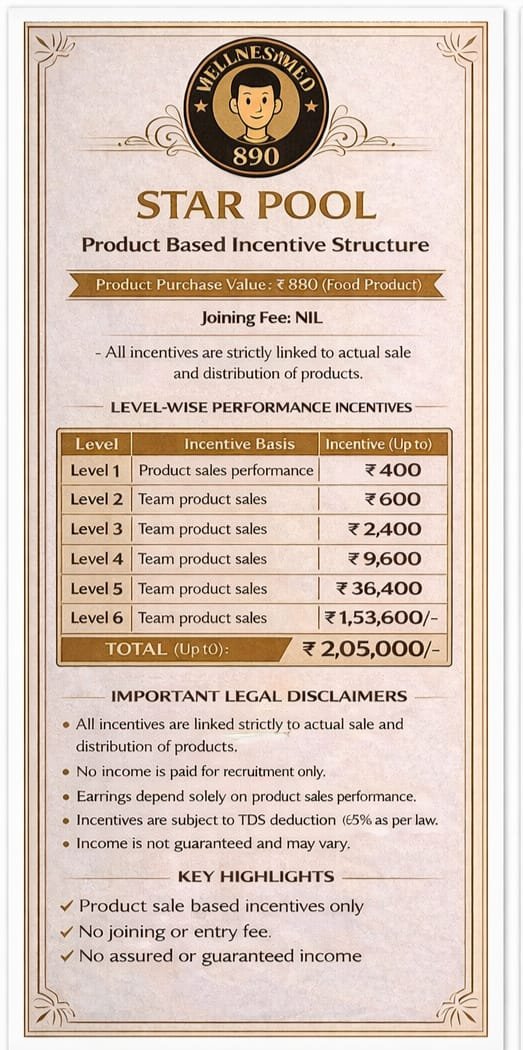 Wellness द्वारा प्रस्तुत incentive structure में ₹2,05,000 तक की सीमा दर्शाई गई है, हालाँकि वास्तविक लाभ व्यक्ति की product sale performance, सहभागिता और कार्य क्षमता पर निर्भर करता है। 👉 कोई assured या guaranteed income नहीं है। हम मानते हैं कि जब व्यक्ति सामाजिक रूप से जागरूक और जिम्मेदार बनता है, तभी वह समाज और परिवार के लिए सकारात्मक योगदान दे सकता है।